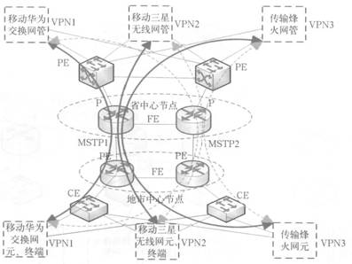 采用MPLS VPN技術(shù)可以把現(xiàn)有的物理實體IP網(wǎng)絡分解成邏輯上隔離的網(wǎng)絡,各隔離開的網(wǎng)絡之間感知不到對方網(wǎng)絡的存在。在物理上是同一硬件設備承載,但在邏輯上網(wǎng)絡是完全隔離的。0SS承載網(wǎng)正是需要這樣的一種承載方式,把各專業(yè)各廠家的多種網(wǎng)管配置到不同的邏輯業(yè)務區(qū)VPN中,如移動華為交換網(wǎng)管配置到VPNl中,移動三星無線網(wǎng)管配置到VPN2中,傳輸烽火網(wǎng)管配置到VPN3中,對每一套網(wǎng)管系統(tǒng)都使用同樣的物理承載不同的VPN完成從地市分公司的網(wǎng)元或終端到網(wǎng)管服務器的連接,各VPN之間相互獨立、相互隔離。