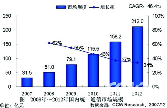 國(guó)內(nèi)外市場(chǎng)分析機(jī)構(gòu)先后推出關(guān)于統(tǒng)一通信的調(diào)查報(bào)告和分析預(yù)測(cè): 計(jì)世資訊今年6月發(fā)布的最新報(bào)告顯示,2008年國(guó)內(nèi)統(tǒng)一通信的市場(chǎng)規(guī)模將達(dá)到51億元人民幣,而從2008年到2012年,在未來(lái)五年的時(shí)間里,國(guó)內(nèi)統(tǒng)一通信市場(chǎng)將保持較快的增長(zhǎng)趨勢(shì),年復(fù)合增長(zhǎng)率將達(dá)到46.4%,截至2012年,國(guó)內(nèi)統(tǒng)一通信市場(chǎng)的規(guī)模將達(dá)到212億元人民幣。