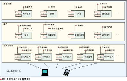 在圖1的網(wǎng)絡(luò)層次中,存在4種服務(wù)商角色:接入網(wǎng)提供商、業(yè)務(wù)網(wǎng)運(yùn)營(yíng)商、業(yè)務(wù)提供商、聚合門戶網(wǎng)站。業(yè)務(wù)網(wǎng)運(yùn)營(yíng)商可以在用戶簽約時(shí)提供多個(gè)業(yè)務(wù)提供者、聚合門戶網(wǎng)站的簽約選項(xiàng),用戶可以選擇在成為業(yè)務(wù)網(wǎng)運(yùn)營(yíng)商的客戶的同時(shí)也成為多個(gè)感興趣的業(yè)務(wù)提供商的會(huì)員,后兩者可以訪問業(yè)務(wù)網(wǎng)運(yùn)營(yíng)商的認(rèn)證、授權(quán)和計(jì)費(fèi)(AAA)基礎(chǔ)設(shè)施,從而對(duì)用戶身份進(jìn)行統(tǒng)一的認(rèn)證、授權(quán)和計(jì)費(fèi)。業(yè)務(wù)提供商和業(yè)務(wù)網(wǎng)運(yùn)營(yíng)商之間的劃分可以采用結(jié)算制也可以采用批發(fā)業(yè)務(wù)的方式。