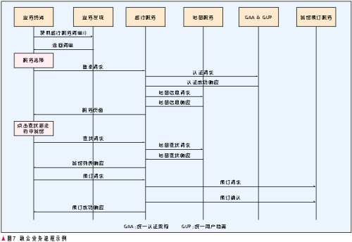 首先王先生的PDA通過歸屬網(wǎng)絡(luò)的業(yè)務(wù)發(fā)現(xiàn)服務(wù)器獲得旅行服務(wù)的主頁(yè)列表,他選擇一家訪問其旅行服務(wù),旅行服務(wù)通過其歸屬網(wǎng)絡(luò)的GAA&GUP對(duì)該終端進(jìn)行認(rèn)證以及提供旅行服務(wù)的授權(quán),成功后,旅行服務(wù)向地圖服務(wù)請(qǐng)求地圖信息并隨服務(wù)頁(yè)面一齊返回給終端,王先生點(diǎn)擊查找“離我最近的中餐館”按鈕,旅行服務(wù)將請(qǐng)求代理轉(zhuǎn)發(fā)給地圖服務(wù),后者返回中餐館列表(用戶的位置信息可以由用戶上報(bào),或者由旅行服務(wù)查詢用戶歸屬網(wǎng)絡(luò)的位置服務(wù)獲得),旅行服務(wù)轉(zhuǎn)發(fā)給終端,當(dāng)王先生選擇一個(gè)中餐館并預(yù)訂時(shí),旅行服務(wù)調(diào)用該餐館的預(yù)訂服務(wù),訂單傳給相應(yīng)服務(wù)人員,流程完成。