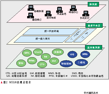 NGSN是為了適應(yīng)網(wǎng)絡(luò)和技術(shù)的融合趨勢、運(yùn)營商轉(zhuǎn)型的需求提出的,通過整合各種網(wǎng)絡(luò)業(yè)務(wù)能力,實現(xiàn)數(shù)據(jù)、業(yè)務(wù)、能力和管理的統(tǒng)一,從而能夠快速提供各種增值業(yè)務(wù)、協(xié)助運(yùn)營商在價值鏈中處于主導(dǎo)地位。其概念層次如圖2所示。