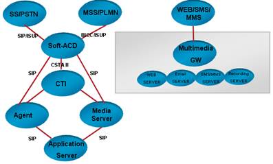 目前市場最常見的第三代呼叫中心是傳統(tǒng)的基于TDM的呼叫中心,應(yīng)用了計算機(jī)電話集成(CTI)技術(shù)。隨著網(wǎng)絡(luò)的普及和NGN的發(fā)展,出現(xiàn)第五代呼叫中心NGCC。NGCC是以NGN為基礎(chǔ)構(gòu)建的呼叫中心系統(tǒng),核心控制設(shè)備處理呼叫的能力較傳統(tǒng)呼叫中心大幅提高。NGCC的網(wǎng)絡(luò)架構(gòu)和接口如圖3所示。