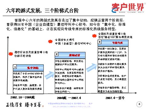 六年的跨越式發(fā)展,走過了集中初始,規(guī)模運營兩個階段。曾經(jīng)獲得也是今天主辦方的06年中國(企業(yè)自建型)最佳呼叫中心稱號。如今在集中化、標準化、信息化的基礎上,正在向?qū)>專席標準化的熱線服務轉(zhuǎn)型。