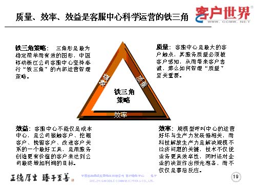應該說這三個方面是科學運營的一個鐵三角,這是我們的理解,因為三角形,始終認為是最穩(wěn)定、簡單、有效的圖形,也是我們在進行內(nèi)部運營的管理鐵架。質(zhì)量是客服中心最大的觸點當中被客戶感知,從而帶來客戶忠誠的,如何管理質(zhì)量,那就至關重要。效率尤其是規(guī)模型的呼叫中心的運營好壞,是與生產(chǎn)力的發(fā)展強相關,而科技解放生產(chǎn)力是解決規(guī)模問題的關鍵。技術不僅是運行更具效益率,同時還對企業(yè)的決策作出預先準備,而不僅僅是事后反應。很多年來,更多的企業(yè)是把客服中心視為成本中心,而事實上,效益的顯現(xiàn)讓我們陸續(xù)地走出了成本中心,它應該是公司接觸客戶、挖掘客戶、挽留客戶、改進客戶關系的一個最好工具,是用服務創(chuàng)造更有價值的客戶,來達到公司最終增加利潤的目標。