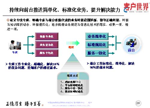 設立專線專席,并不是指專線越專越多,而是持續(xù)地向前臺推送簡單化、標準化的業(yè)務,提升前臺一線的解決能力,所以我們重點以專線的技能專業(yè)化、業(yè)務復雜化、服務個性化,然后把簡單的形成規(guī)范標準的業(yè)務向前臺推送,保障專席的工作是專業(yè)化、精確化地解決10%的復雜問題,從而更多地去挖掘客戶的需求。而前臺客服的工作是用標準化、簡單化地解決90%的基本問題。