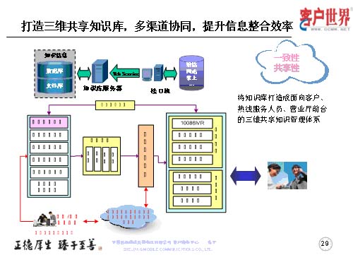 打造三維共享知識庫,多渠道協(xié)同,提升信息整合效率。我們的知識庫服務器是基于客戶系統(tǒng)的大平臺,形成熱線服務人員、營業(yè)廳人員,乃至客服經(jīng)理的三維共享知識庫共享,以保障了服務的一致性,服務渠道的共享性。