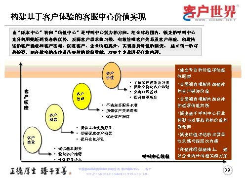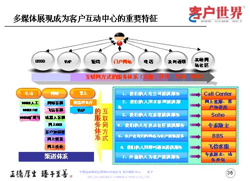 世界上卓越的企業(yè)無所不在,在客戶戰(zhàn)略上最具創(chuàng)新能力的企業(yè),奠定起的競爭,也會越來越出體現(xiàn)在客戶關系管理上,隨著數(shù)據(jù)業(yè)務成為運營商的主流業(yè)務,呼叫中心在服務、營銷、渠道管理等方面的戰(zhàn)略地位會日益重要,隨著客戶接觸的不斷增長,呼叫中心將逐漸演變成客戶接觸中心、互動中心,乃至包括實體渠道之外的各種電子渠道,任重而道遠。