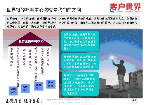 最后我想世界級的呼叫中心戰(zhàn)略是我們從事客戶服務行業(yè),從事呼叫中心人的方向,從我們理解的世界級呼叫中心特征來講,管理團隊應對呼叫中心的運營原理有系統(tǒng)的理解,并貼切地應用到業(yè)務實踐,創(chuàng)造積極向上的工作氛圍,鼓勵員工成長,能夠闡述呼叫中心的戰(zhàn)略價值,制訂并達到本部門的目標,為企業(yè)利潤的增長作出杰出的貢獻,杰出的員工滿意度和客戶滿意度。所以世界級呼叫中心我們理解是從七個方面來衡量,以“客戶為中心”,多種客戶溝通的聯(lián)絡渠道,低員工流失率和高客戶滿意度,高效率、低成本,高“一次性解決率”,對客戶服務請求的快速反應與處理,技術驅(qū)動與創(chuàng)新。