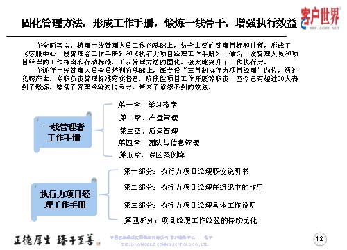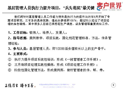 大家知道基層管理人員其實是兵頭將尾的最關鍵,我們將對基層管理人員的工作能力,特別是執(zhí)行力的提升是從05年8月份就開始了專項研究,三年多的具體實踐,值班長的培訓率達到100%,超過50人經(jīng)過了項目經(jīng)理的角色鍛煉,目前很多擔任過項目經(jīng)理的已經(jīng)承擔了生產(chǎn)調(diào)度、話務管理等重要的管理崗位。在這個項目當中,我們從四個方面入手,工作目標是鍛煉人、培養(yǎng)人、發(fā)展人。指導思想是案例教育、項目實踐,固化規(guī)范管理標準、方法,傳承管理經(jīng)驗。參與人員就是基層管理人員,話務值班長以上的生產(chǎn)骨干。我們主要運用的形式是執(zhí)行力提升項目系統(tǒng)培訓,形成了《一線管理者工作手冊》。三月制項目經(jīng)理的實踐操練,通過競聘的方式產(chǎn)生,形成了《項目經(jīng)理工作手冊》。階段性的固化-優(yōu)化-再固化的管理方法,形成案例庫,做好管理者的傳幫帶。