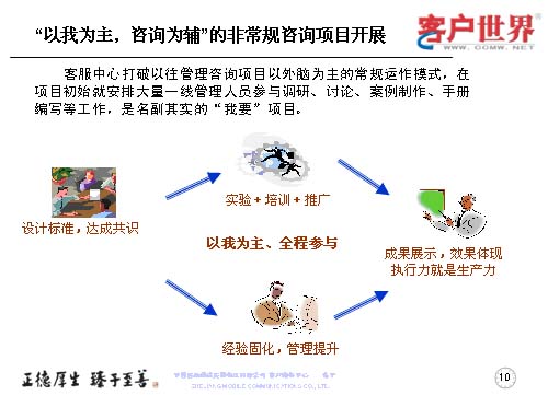 這個管理咨詢項目開展中,是以我為主,咨詢?yōu)檩o的非常規(guī)咨詢項目,打破的是以外腦為主的常規(guī)運作模式,在項目初期就有大量的一線管理人員參與調(diào)研、討論、案例制作、手冊編制,是名副其實的“我要”項目。那么在這個方面我們分成了三部曲,設計標準、達成共識,通過實驗加培訓推廣,以我為主的全程參與,來固化經(jīng)驗,提升管理。最后成果展示,效果體現(xiàn)于執(zhí)行力,彰顯出生產(chǎn)力。
