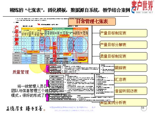 我們精煉了這么七張表的方式,運用三個維度:產(chǎn)量管理、質(zhì)量管理和團隊與信息管理,而這些基礎數(shù)據(jù)都來自于系統(tǒng),教學和案例。而七張表是從產(chǎn)量、質(zhì)量和團隊信息來展現(xiàn)出具體的一些應用,將一線管理人員從日常工作的三個維度入手,形成七張表管理模式,很好地具備了操作標準和規(guī)范。這模板表除了系統(tǒng)出來的一些數(shù)據(jù)以外,通過我們基層管理人員的項目執(zhí)行和跟蹤檢查,形成一些案例,改進計劃和改進意見。這幾張表多為系統(tǒng)自身所產(chǎn)生一些具體的數(shù)據(jù),比如說上個月的指標值如何設定,實際達成的產(chǎn)量怎樣,回訪滿意率具體有哪些數(shù)據(jù),都在客服系統(tǒng)的報表中提煉出來的相關數(shù)據(jù)。