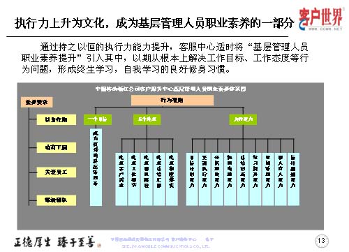 在執(zhí)行力上升文化的同時,基層管理者的職業(yè)素養(yǎng)是我們時刻去追求的,所以客服中心適時地將基層管理人員的職業(yè)素養(yǎng)引入到其中,以期從根本上解決工作目標、工作態(tài)度等問題,形成終生學習,自我學習的良好修身習慣。這是我們客服中心基層管理人員職業(yè)素養(yǎng)的一個體系圖,首先從素養(yǎng)要求的四個維度,行為準則的一、五、九來展現(xiàn)。一個目標是成為優(yōu)秀的管理者,五個注重是注重客戶需求、注重工作細節(jié)、注重團隊建設、注重總結(jié)匯報、注重制度落實。九種能力:目標計劃能力,貫徹執(zhí)行能力、分析解決能力、協(xié)調(diào)溝通能力、總結(jié)創(chuàng)新能力、時間管理能力、師人育人能力和標桿超越能力。這個一、五、九,讓它彰顯出素養(yǎng)和表現(xiàn)的四個維度,以身作則、培育下屬、關愛員工和鍛造團隊。