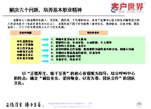 一線客服人員如何來全面提升職業(yè)能力,首先是解決一線客服人員的六個問題,剛才已經(jīng)跟大家交流了客服中心一線人員的人員結(jié)構,當前的六個主要問題可以用簡單的幾個方面來表述:對生活沒有明確的目標、對自己不進取、對工作不負責、對同事不合作、對顧客不關心、對企業(yè)不忠誠,這是在日常工作中,一線人員所存在的問題。而針對這些問題,我們要用工作目標去持續(xù)解決和克服問題,所以我們采取的是讓大家明確企業(yè)目標與個人使命,用積極的心態(tài)自主自發(fā),主動積極和個人領導;良好的工作態(tài)度責任心,良好的團隊合作氛圍;熟練掌握溝通技巧和方法,牢固樹立顧客滿意的意識,以客為尊;良好的行為素質(zhì)習慣,自我學習,終身學習。從而在中國移動集團“正德厚生、臻于至善”的核心價值觀指導下,結(jié)合呼叫中心特點,確定誠實務信,愛崗敬業(yè),以客為尊、團隊合作的團隊文化。