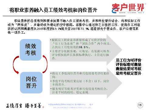 職業(yè)素養(yǎng)不是說在嘴上,講在課上,而是更多地融入到員工的績效考核于崗位晉升當中。以解決工作素養(yǎng)要求和實際工作的兩張皮,以及使得客服理念成為理論的空中樓閣。所以我們是持之以恒地開展一線員工組織認同滿意度調(diào)查,我們每年都會做一線客服人員的滿意度調(diào)查,在滿意度調(diào)查當中,從05年的69.3%,提升到07年的73.9%,而且遙遙領先于營業(yè)員和客服經(jīng)理。而在績效考核中主要把員工行為素質(zhì)、團隊合作占到了員工月度績效的16.5%,使大家認識到作為一個組織中的一員,作為團隊我們是為了一個共同的目標,彼此依賴、彼此信任,同時也要強化績效來管理。所以主要的評分依據(jù)是客觀、可衡量、有依據(jù)可查,同時也把這些也作為客服人員季度晉升和月度績效考評掛鉤,如果該員工季度的平均考核在良好以下的話,將得不到晉升,最終實現(xiàn)的是員工行為可評價,評價標準可衡量,衡量結(jié)果可考核,最終考核定晉升。