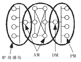 混合式組播的核心任務是為AM完成拓撲(包括數據拓撲和控制拓撲)的構建。由于網絡狀況的動態(tài)性,以及客戶端數量與客戶端加入系統(tǒng)時間的不確定性,當前的應用層組播方案一般需要每個結點定期與其他全部或一定比例的結點交換控制信息,以了解其他結點的狀態(tài),形成控制拓撲,保障數據拓撲的健壯性。在結點個數逐漸增加時,網絡上的控制信息數量會占用大量的帶寬資源。應用層組播的數據拓撲可分為二大類:信源樹和共享樹。信源樹必須為每個組播源保存路由信息,這樣會占用大量的系統(tǒng)資源。共享樹傳輸延時較大。IP視頻會議系統(tǒng)屬于實時交互應用,視音頻數據占據很大的帶寬,并且對端到端傳輸延遲和網絡抖動的要求很高,需要尋找一種既可以減少交換控制信息又可以保證視音頻數據實時傳輸的拓撲構建方式。為利用排列圖的優(yōu)越特性(如結點和邊的對稱性、故障恢復能力和容錯能力、可以嵌入獨立的組播樹等),這里采用分層排列圖的結構來組織混合式組播中的AM。