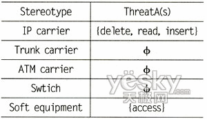針對圖1中定義的定型以及對網(wǎng)絡安全構成威脅的攻擊者的類型,可以定義出威脅函數(shù)TheatA(s)。其中A表示攻擊者類型,這里假定攻擊者為具備一般能力的外部攻擊者,即其可以竊聽到廣播信道上的數(shù)據(jù)流量,并可以插入或刪除數(shù)據(jù)流量,能夠利用系統(tǒng)漏洞入侵系統(tǒng);表示為模型中定義的定型威脅函數(shù)的值域為{delete,read,insert,access}。根據(jù)NGN中承載網(wǎng)絡和計算節(jié)點的特性,我們可以得出如下威脅函數(shù),如表1所示。