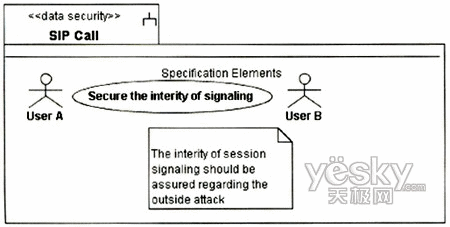 圖3中的UA代表UserA或UserB的UA,因為兩個UA的信令交互需要通過Proxy,且其安全需求是一致的,故在圖中只表現(xiàn)出一方。UA和Proxy均是基于通用計算平臺的節(jié)點,其訪問控制需要受到保護,故對其標記上定型《guardedaccess》。UA中除處理信令外,還需處理媒體流的編解碼與控制,這個用例中只涉及信令的安全性,故在UA中只關注進行信令控制的組件。UA與Proxy之間的通信基于IP承載,根據(jù)表1定義的威脅函數(shù):ThreatA(IP