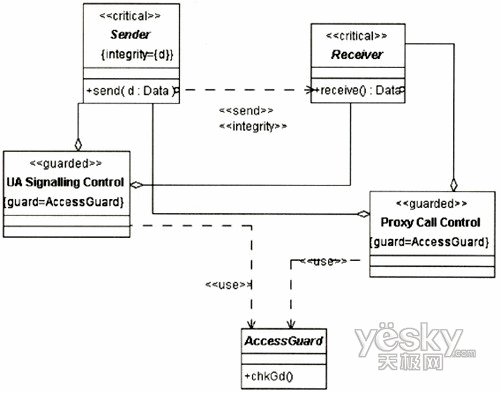Sender類和Receiver類是通過對通信安全功能的抽象而得出的兩個類。這兩個類具備保證發(fā)送方和接收方之間消息傳送的完整性的安全能力。通過在UA的信令控制功能和Proxy的呼叫控制功能中聚合這兩個類,可以在高層的需求層面上滿足UA和Proxy通信的信令完整性需求。