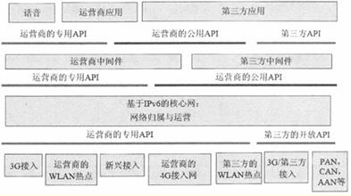 在某種意義上,下一代網(wǎng)絡(luò)必須是一種可編程的、基于IP的網(wǎng)絡(luò),這必然要求XG為應(yīng)用開發(fā)提供強(qiáng)大的、方便的、定義明確的API。對于一些業(yè)務(wù)提供商來說,API思想本身并非僅僅是一個基本概念。目前,公共API是指所有第三方都可用的API,它包括標(biāo)準(zhǔn)的、開放的API子集。另一方面,專用API是指由某個公司控制、僅僅在公司內(nèi)部或合作伙伴內(nèi)部可用的API。圖1給出了下一代網(wǎng)絡(luò)API體系結(jié)構(gòu)的一種高級分類方法。