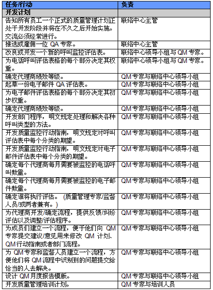 4. 開展項目交流。管理人員必須就新的或者修繕后的QM計劃與代理商進行交流。QM的成功與否與代理商的合作密不可分,如果代理商受邀參與新QM計劃的開發(fā)并且所有改變都在雙方之間明確交流過,那么成功的機會也將大大提高。交流的內(nèi)容應包括為什么要開發(fā)這樣一個計劃,它的作用和職責是什么,它對代理商會產(chǎn)生哪些影響(對于他們的評估和提升)以及它能帶來哪些好處。幫助代理商認識到QM計劃積極的一面很重要,因為只有這樣才能讓他們看到QM不僅僅是管理人員用來告訴他們做錯了事情的一種手段。讓聯(lián)絡中心全體員工參與QM計劃的開發(fā)能夠建立他們對該計劃的支持,提高接受度的同時避免不知所措。這對聯(lián)絡中心剛剛嶄露頭角,QM計劃還未全面鋪開的中國市場而言尤為重要。