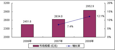 圖3 2006-2008年中國(guó)通信設(shè)備市場(chǎng)規(guī)模及增長(zhǎng)
