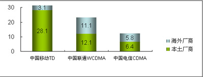 在3G設(shè)備市場(chǎng)方面,2008年,中國(guó)的WCDMA、CDMA2000與TD-SCDMA三種3G網(wǎng)絡(luò)在建設(shè)上有不同的進(jìn)展。中國(guó)移動(dòng)啟動(dòng)了第二階段的TD-SCDMA網(wǎng)絡(luò)建設(shè)、中國(guó)電信啟動(dòng)了涉及面向81個(gè)重點(diǎn)城市的CDMA全網(wǎng)招標(biāo)、而中國(guó)聯(lián)通也開始7個(gè)城市建立WCDMA試驗(yàn)網(wǎng)絡(luò)的建設(shè)工作。而在所有的網(wǎng)絡(luò)建設(shè)中,中國(guó)本土廠商借3G契機(jī)迅速提升競(jìng)爭(zhēng)力,占據(jù)了3G網(wǎng)絡(luò)建設(shè)大部分市場(chǎng)份額。