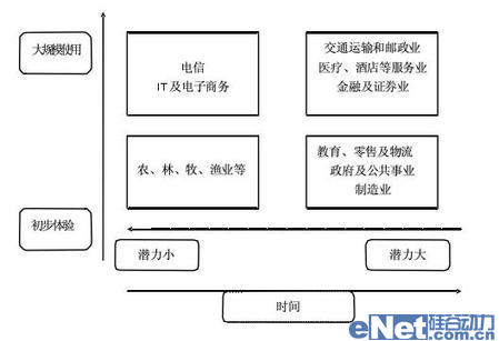 象限2--代表位于該象限的行業(yè)只是初步使用通信產(chǎn)品,并且該行業(yè)對通信產(chǎn)品需求不高,市場空間不大。該行業(yè)主要靠勞動(dòng)力和自然資源獲取利潤,一般現(xiàn)代化程度較低,對通信要求不高,供應(yīng)商利潤不大。