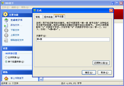 對于單個批量轉(zhuǎn)換的用戶而言,UMD舵手擁有智能斷章功能,完美解決了TXT電子書在手機上無法分章的難題。在“章節(jié)設(shè)置”選項卡中輸入用于制作章節(jié)目錄的關(guān)鍵字。例如:1、“第一章華山論劍”,則輸入的關(guān)鍵字可為:“第*章”;“一、華山論劍”,則輸入的關(guān)鍵字可為:“N、”;“【華山論劍】”,則輸入的關(guān)鍵字可為:“【*】”;“1-3-5節(jié):華山論劍”,則輸入關(guān)鍵字可為:“N-N-N