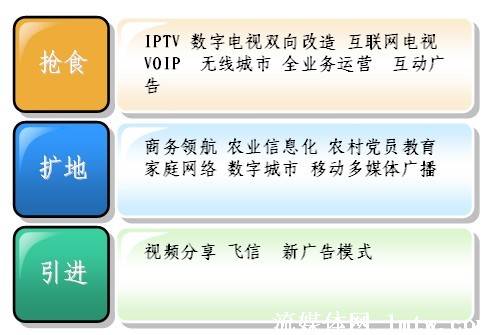 從廣義上講,廣電、電信、互聯(lián)網(wǎng)都屬于信息行業(yè),現(xiàn)在都面臨著自己在增長中遇到的問題,也就是滯漲。滯漲逼迫大家必須去轉(zhuǎn)型,轉(zhuǎn)型現(xiàn)在有三種方式,一個是搶,一個是擴,一個是引進(jìn)。從最近會議上來看,目前大家對搶食比較感興趣,畢竟有現(xiàn)成的一碗紅燒肉已經(jīng)做好了,對后面兩個,相對來說談得還比較少,因為后面兩個,需要引入一些創(chuàng)新的技術(shù),引入創(chuàng)新的思維。