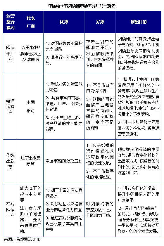 International)分析認(rèn)為,目前中國(guó)電子書(shū)市場(chǎng)以閱讀器廠(chǎng)商及電信運(yùn)營(yíng)商兩種力量為主導(dǎo),此外還包括傳統(tǒng)出版商、在線(xiàn)閱讀廠(chǎng)商等其他力量。對(duì)現(xiàn)有各種運(yùn)營(yíng)模式的企業(yè)分析如下: