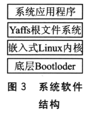 整個系統(tǒng)軟件結(jié)構(gòu)從下到上大體可分為3個層次,如圖3所示:底層的Bootloder、嵌入式Linux內(nèi)核以及系統(tǒng)應用程序。