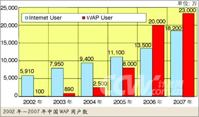 2002年~2007年中國(guó)WAP用戶數(shù)