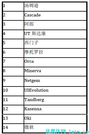 在中國市場上,UT 斯達康和中興公司暫時領先于其他公司。其中,UT 斯達康在海外也有不俗的表現,如在印度和日本市場等;華為公司可以借助其整體解決方案的實力,有機會在下一代基于IMS 的IPTV 解決方案中脫穎而出。MRG 曾經在2007 年3 月公布過一個市場調查,對IPTV 中間件及其市場影響力進行了一個排名,具體的結果見表1。