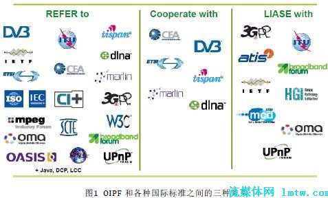 圖1 描述了OIPF 和其他國際標準之間的關系——基本是三種關系:參考、合作和協(xié)調。這也是為什么OIPF 在較短的時間內能夠制訂和發(fā)布較為完善的標準系列的原因。