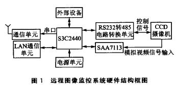 本系統(tǒng)采用三星公司的S3C2440嵌入式處理器和arm-linux2.4.26操作系統(tǒng);S3C2440使用ARM920T內(nèi)核,主頻是400MHz;除了集成通用的串口控制器、USB控制器、A/D轉(zhuǎn)換器和GPIO等功能之外,還集成了一個攝像頭接門(CAMIF)(這個接口是遠(yuǎn)程圖像采集的核心部分)。系統(tǒng)在S3C2440處理器的控制下,從CCD攝像機(jī)采集模擬視頻信號,然后經(jīng)過編碼、DMA傳輸?shù)絻?nèi)存緩沖,接著由軟件對內(nèi)存中的數(shù)字視頻數(shù)據(jù)進(jìn)行壓縮和打包.最后通過通信單元將圖像以IP包的方式發(fā)送到監(jiān)控中心的服務(wù)器。整個系統(tǒng)的硬件結(jié)構(gòu)原理如圖1所示