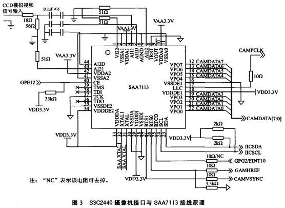 S3C2440的攝像機(jī)接口接收ITU標(biāo)準(zhǔn)的圖像數(shù)據(jù),不能直接接收CCD攝像機(jī)輸出的模擬視頻信號,因此還需要1片SAA7113視頻解碼芯片。SAA7113可以輸入4路模擬視頻信號,通過內(nèi)部寄存器的不同配置可以對4路輸入進(jìn)行轉(zhuǎn)換,輸入可以為4路CVBS或2路S視頻(Y/C)信號,輸出8位“VPO”總線,為標(biāo)準(zhǔn)的ITU656、YUV