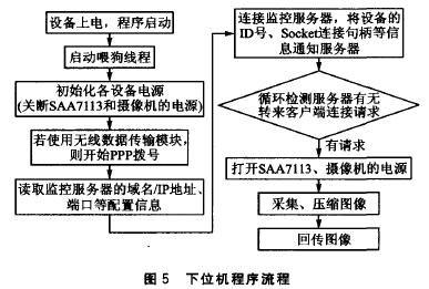 下位機(jī)軟件通過驅(qū)動程序提供的接口,在遠(yuǎn)程圖像監(jiān)控設(shè)備中完成硬件的初始化、控制等功能,同時(shí)又負(fù)責(zé)圖像的壓縮和傳輸。它是所有設(shè)備的控制中樞,因此這里著重描述下位機(jī)軟件的工作流程,如圖5所示。