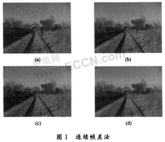 綜合考慮以上四種背景提取方法,本文采用結(jié)合多幀圖像平均法和連續(xù)幀差法這兩種方法來進(jìn)行視頻序列背景的提取?紤]到運(yùn)動目標(biāo)的多樣性,有目標(biāo)經(jīng)過視場而引起的變化長時(shí)間內(nèi)可忽略不計(jì)。多幀圖像平均法時(shí)將運(yùn)動目標(biāo)看作為噪聲,用累加平均的方法消除噪聲,利用目標(biāo)運(yùn)行一段時(shí)間的序列圖像進(jìn)行平均而得到視場背景圖像。連續(xù)幀差算法是通過當(dāng)前幀的圖像與前一幀圖像的差值找到運(yùn)動區(qū)域,對運(yùn)動區(qū)域的背景保持不變,而非運(yùn)動區(qū)域的背景則用當(dāng)前幀進(jìn)行更新,經(jīng)過一段時(shí)間的迭代便可提取出背景。兩種方法的結(jié)合可以很好地彌補(bǔ)各自的缺點(diǎn),能夠適應(yīng)鐵路沿線周邊環(huán)境的要求,對存在運(yùn)動目標(biāo)的背景能夠提取出質(zhì)量較高的背景圖像。具體過程如下: