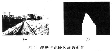 圖像二值化后的結(jié)果如圖2(a)所示,得到的最終結(jié)果如圖2(b)所示。從兩幅圖像的對比可以看出,圖像經(jīng)過一系列處理后,基本標(biāo)定了危險(xiǎn)區(qū)域。對于得到的圖2(b),圖中白色的區(qū)域?yàn)殍F道雙軌內(nèi)部即設(shè)定的危險(xiǎn)區(qū)域。應(yīng)用此種方法得到的結(jié)果圖像在光照條件充足情況下能夠得到更好的效果,不適用于光照條件不足和夜間的危險(xiǎn)區(qū)域標(biāo)定。