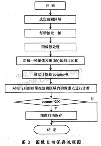 對每一幀都做上述處理,經(jīng)過一段時(shí)間的監(jiān)測后,系統(tǒng)會自動保存一些危險(xiǎn)情況存在時(shí)的圖像(灰度圖形式)。圖像自動保存方法流程圖如圖3所示。