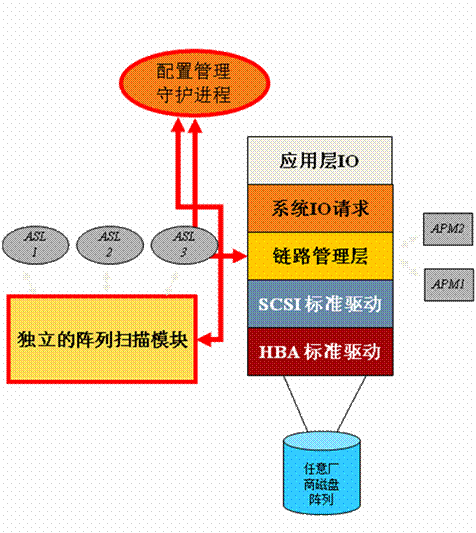 該技術(shù)的特點(diǎn)是通過主機(jī)層軟件方式建立存儲(chǔ)管理虛擬層,利用專業(yè)的第三方鏈路管理軟件解決磁盤陣列和主機(jī)的連通兼容性。其運(yùn)行依靠工作在存儲(chǔ)網(wǎng)絡(luò)鏈路管理層的軟件程序來完成,其體系架構(gòu)圖如下: