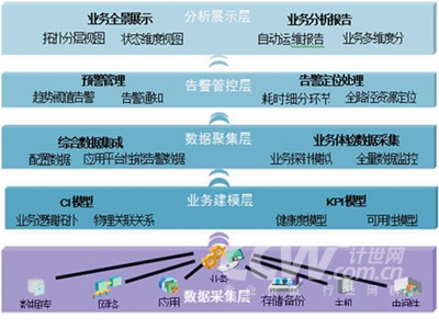CI/KPI指標體系的建立是以業(yè)務為主線,按照“CI業(yè)務-應用-平臺”的分層結構,針對每一層設定支撐域、運營域和服務域的指標分類標準,并在這些指標的基礎上通過關系推導和加權計算創(chuàng)建業(yè)務健康度和可用性量化模型,將業(yè)務的層層嵌套、互相關聯(lián)與后臺軟硬件平臺之間的關系都量化出來,并綜合為直觀有效的業(yè)務運營狀況指標; 作為監(jiān)控系統(tǒng)的核心,業(yè)務建模層為告警管控層的預警和故障定位提供了衡量基礎和分析邏輯,如果健康指標超出經(jīng)驗化閾值,業(yè)務預警可幫助維護人員將業(yè)務隱患消除于萌芽之中。