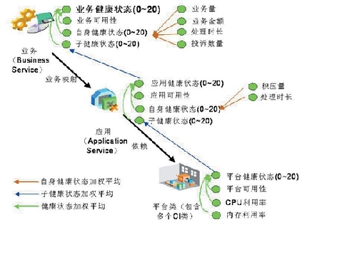 CI/KPI模型的建立,成功地將傳統(tǒng)監(jiān)控系統(tǒng)的監(jiān)控難點轉變?yōu)榱咙c,通過對模型中父子業(yè)務間關系、業(yè)務與后臺資源間關系的結構化梳理,多維度數(shù)據(jù)的采集計算,有效量化了業(yè)務健康度指標。同時,模型中所綜合的業(yè)務可用性、業(yè)務辦理量、后臺資源使用情況等全方位信息,尤為適合公司管理人員了解業(yè)務通體運營情況。