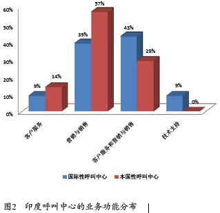印度的呼叫中心可分為兩類:一類面向國際市場(chǎng),另一類服務(wù)本國市場(chǎng)。如班加羅爾等6個(gè)城市的60家呼叫中心中,74%(44家)專門服務(wù)于國際市場(chǎng),26%(16家)服務(wù)于本國市場(chǎng)。