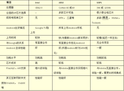 這三種處理器架構(gòu)各有優(yōu)缺點,都希望成為未來Android互聯(lián)網(wǎng)電視(如果成功的話)的最主流平臺。那么哪一個處理器將最終勝出呢,答案只有留給時間來揭曉,我們不妨先來對這三個架構(gòu)進(jìn)行一番比較: