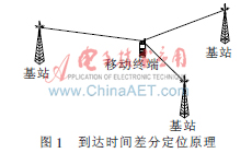 TDOA作為主要的定位技術(shù)在第三代移動通信網(wǎng)絡(luò)中得到了廣泛的應用。在3GPP的WCDMA中,基于TDOA定位技術(shù),即觀測到達時間差分OTDOA(Observed Time Difference of Arrival);在3GPP2的CDMA2000中,稱為高級前向鏈路三角測量法A-FLT(Advanced Forward Link Trilateration)。這些方法的原理相同,都是通過信號到達時間差值,確定不少于兩條雙曲線,再通過這些雙曲線的交點,確定移動臺的位置。到達時間差分定位原理如圖1所示。