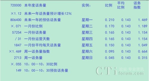 在上圖所示的比例分解過程中,我們假設(shè)去年的總來電量為720000個。在此基礎(chǔ)上,根據(jù)市場、銷售預(yù)測以及過去幾年歷史數(shù)據(jù)增長趨勢等數(shù)據(jù)測算出未來一年的話務(wù)量預(yù)計增長12%。這樣我們就得到了預(yù)計未來一年的總來電量為806400個。根據(jù)歷史數(shù)據(jù)的測算分析,一月份的來電量通常占全年總來電量的7.1%,因此明年一月份的來電量預(yù)計為57254個。由于呼叫中心是7X24小時運營的,所以一月份平均每天的來電量為57254/31=1847個。由于大多數(shù)呼叫中心的來電量規(guī)律是以一周為周期循環(huán)波動的,因此我們接下來要測算四個(或五個)周一的話務(wù)指數(shù),以覆蓋四個或五個周一的來電量情況。我們用周一來電量占全周來電量的相對比例除以其七分之一的絕對比例,得出周一的來電量指數(shù)為1.469,也就是說,周一的來電量是相對較多的,相當(dāng)于一周日平均來電量的約147%。由此我們得出周一話務(wù)量為2713個。然后我們再根據(jù)由歷史數(shù)據(jù)測算出的周一一天中48個半小時時段占全天來電量的比例測算出周一上午10:00-10:30的來電量為149個。剩下的周二至周日都可以采用同樣的方法來推算預(yù)測。
