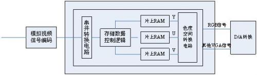 嵌入式攝像控制系統(tǒng)除了必要的電源電路以外,還要包括存儲(chǔ)電路、通信電路和下載電路等,所有的設(shè)備均與Avalon總線連接,這里主要介紹用戶邏輯接口Camera_show,它完成了模擬視頻數(shù)據(jù)轉(zhuǎn)化成數(shù)字視頻數(shù)據(jù)并在VGA上顯示的功能,主要包括模擬視頻信號(hào)的采集、分配(串并轉(zhuǎn)換電路完成)、存儲(chǔ)(存儲(chǔ)控制邏輯和片上RAM完成)和色度空間轉(zhuǎn)換。具體的功能框圖如圖1所示。