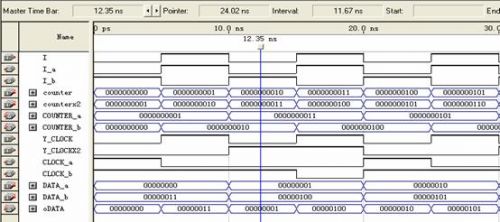 使用的信號(hào)包括:數(shù)據(jù)信號(hào)data_a,dat_b;讀寫有效信號(hào)wren_a,wren_b;地址信號(hào)address_a,address_b;時(shí)鐘信號(hào)clock_a,clock_b;輸出數(shù)據(jù)信號(hào)q_a,q_b。可以看到所有的信號(hào)都是成對(duì)出現(xiàn)的,就是為了進(jìn)行乒乓方式的數(shù)據(jù)傳輸。分成了兩個(gè)RAM區(qū)域,A和B,相當(dāng)于前面講乒乓方式里的數(shù)據(jù)緩沖模塊1和2。兩個(gè)RAM塊是交替著讀寫(由I_a和I_b決定),輸出數(shù)據(jù)流也是由I決定。剛說到寫時(shí)鐘是13.5M,讀時(shí)鐘是27M,所以clock_a和clock_b必須是讀寫時(shí)鐘切換著輸入,而且地址的計(jì)數(shù)也不一樣,寫周期時(shí)候地址增加的時(shí)鐘是13.5M,讀周期地址增加的時(shí)鐘是27M。所以每行的數(shù)據(jù)讀了兩遍,相當(dāng)于隔行變逐行。圖6在Qartus II下RAM的乒乓操作功能仿真圖: