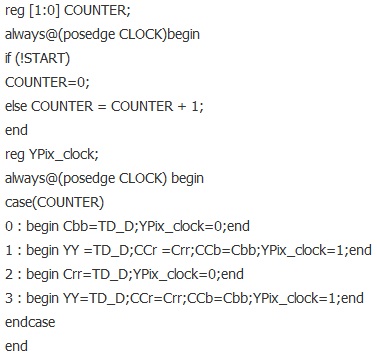 以上代碼完成了圖3的功能,輸入的信號(hào)名為TD_D,輸出的三路信號(hào)是Cbb,YY,Crr。注意到還有個(gè)YPix_clock,實(shí)際上是27M的2分頻,這個(gè)時(shí)鐘非常有用,在下面將詳細(xì)闡述。